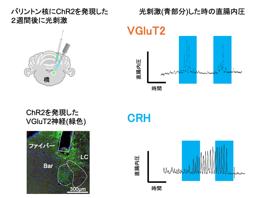 チャネルロドプシン2 (ChR2) という膜タンパク質を発現させた神経細胞に青色光を照射すると、人為的に神経を興奮させることができる (図左上、左下)。オプトジェネティクスと呼ばれるこの手法を用いてバリントン核の神経活動と直腸内圧の関係を調べたところ、VGluT2 神経を興奮させた時には即時かつ非持続的に直腸内圧が上昇し (図右上)、CRH 神経を興奮させた時には直腸内圧はやや遅れて持続的に上昇した (図右下)。