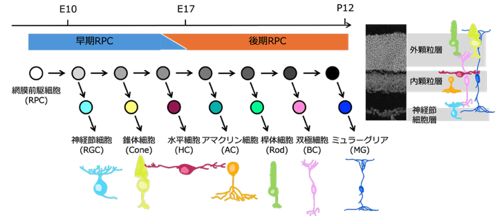 網膜の各細胞は、共通の網膜前駆細胞 (RPC) から一定の順序で分化する (左図)。最終的に細胞体は3層構造となり神経回路を形成する (右図)。