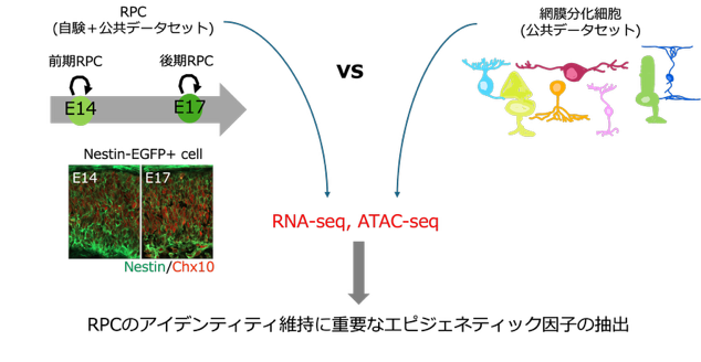 発生段階の異なる RPC および網膜分化細胞の遺伝子発現とクロマチン構造を比較解析することで RPC の性質維持に重要な因子の同定を目指した。