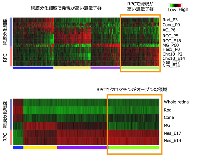 遺伝子の発現パターン (上図) と、遺伝子が使われやすい状態かどうかを示す指標 (下図) を解析し、RPC と分化した網膜細胞の違いを比較した。四角で示した部分は、RPC で特に強く保たれている特徴で、分化に伴って分子レベルの性質が大きく変化することがわかった。