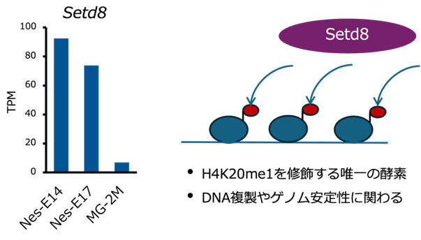 さらに統合解析から、RPC の性質維持を担う主要なエピジェネティック因子として Setd8 を同定しました。Setd8 は ヒストン H4 のリジン20番目に一重メチル化 (H4K20me1*7) を加える唯一の酵素です (図4)。Setd8 は、RPC では発生期を通じて持続的に発現する一方、成熟ミュラーグリア細胞ではほぼ消失していました。