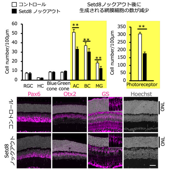 Setd8 遺伝子を時期特異的に欠失させると、本来生成されるはずの網膜細胞の数が減少した。
