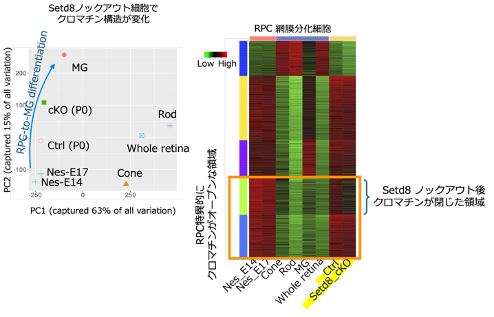 Setd8 を欠失させた RPC では、正常な RPC や網膜分化細胞とは異なるクロマチン構造が観察された (左図)。特に、RPC において前駆細胞らしさを保つために重要な「開いた」クロマチン領域で大きな変化が生じていた (右図)。