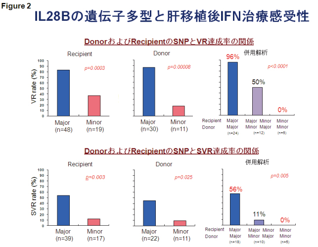 九州大学第二外科のグループでは世界に先駆けて生体肝移植症例 でIL28B遺伝子多型解析を行い、生体肝移植を受けたレシピエントのみならず、 臓器を提供していただいたドナーのIL28B周囲遺伝子多型も生体肝移植後のIFN治療効果を予測することを見出した。