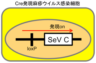 図 Cre-loxPを利用したセンダイウイルスCタンパク質(SeV C)発現システム 左:ウイルス非感染細胞では、SeV Cが発現しないように、2つのloxP配列間で転写がストッ プするようにしておく。この細胞は、正常な免疫応答をするのでウイルスに抵抗性である。 右:Creを発現する麻疹ウイルスが感染すると、Creの働きによりloxP間の配列が切り取られ、下流のSeV Cが発現する。 そのため、免疫応答が抑えられ、ウイルスはより良く増殖するようになる。 |