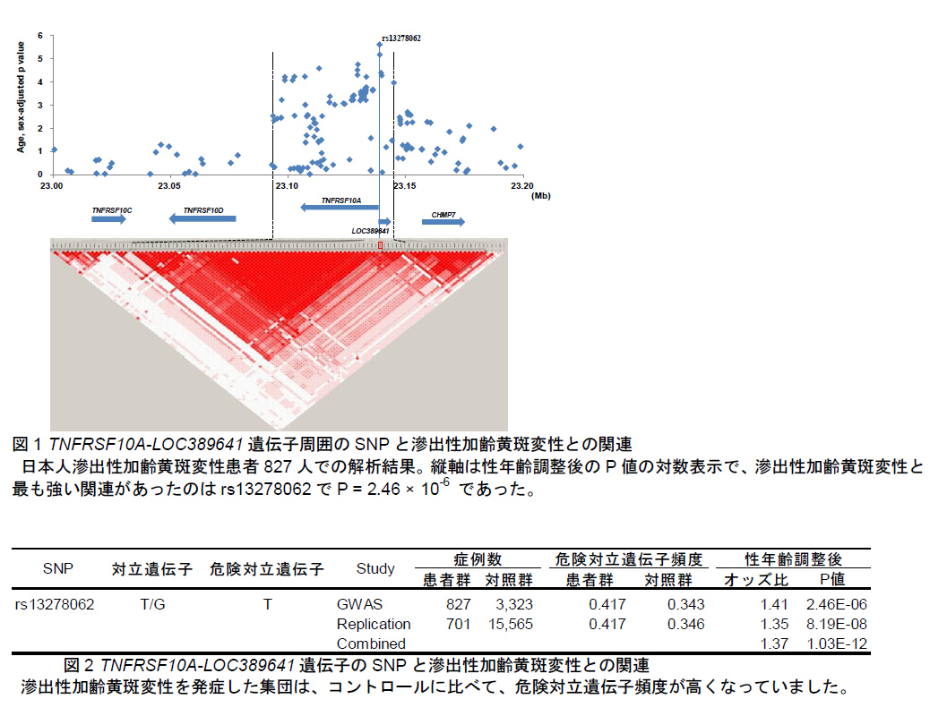 九州大学大学院医学研究院眼科学の石橋達朗教授のグループは、加齢黄斑変性の発症に関わる一塩基多型(SNP *1)が腫瘍壊死因子受容体スーパーファミリー10A(TNFRSF10A)遺伝子*2のプロモータ領域にあることを明らかにしました。この発見は、加齢黄斑変性の新規診断法および治療薬の開発につながる可能性があります。これは、理化学研究所ゲノム医科学研究センター多型解析技術開発チームの久保充明チームリーダー、東京大学医科学研究所の中村祐輔教授との研究成果です。本研究成果は、2011年9月11日 (日本時間9月12日) に米国科学雑誌「Nature Genetics」のオンライン速報版で公開されました。