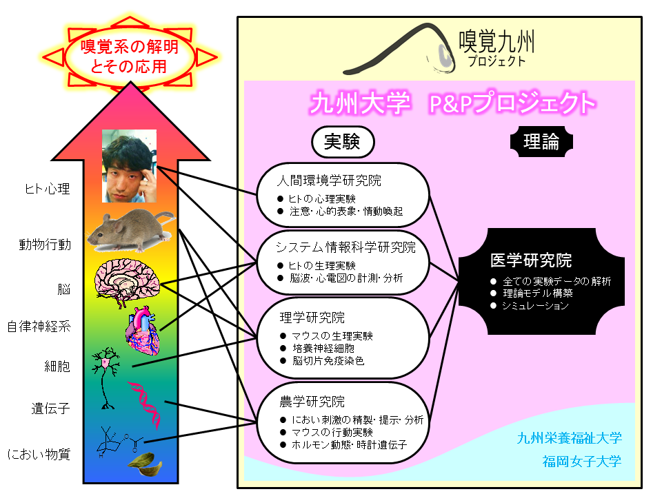 本プロジェクトの目的は、「においという環境刺激を利用して生物がいかに生体システムを制御しているのか?」に答えることです。そのため、実験家と理論家が連携し、においが生体に及ぼす影響を、遺伝子から細胞、自律神経系、脳の嗅覚系、行動、心理に至る超多階層な領域で、実験と理論の双方から調べます。生物としてのメカニックな環境応答メカニズムを明らかにするためにマウスを用いた実験を、においの心的メカニズムを明らかにするためヒトを用いた実験を行います。それらの実験データを基に理論モデルを構築し、統合的な嗅覚メカニズムの説明と予測を行っていきます。
