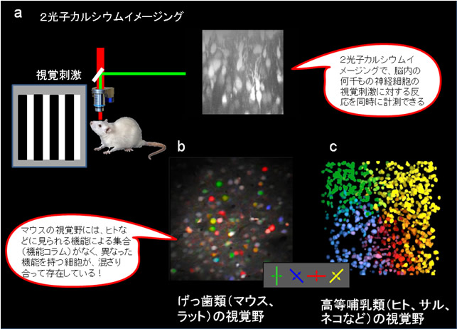 ヒト、サル、ネコなど、高等哺乳類の大脳皮質の一次視覚野には、同じ機能-例えば同じ方位選択性-の細胞が集まって存在する機能コラムが存在することが知られている(図2c)。この機能コラムの存在は、方位選択性などの感覚情報を処理するために重要であると考えられてきたが、げっ歯類の一次視覚野には機能コラムがないことが示された。