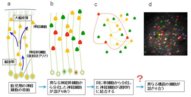 | (a) | 1つの神経幹細胞の子孫の分布。胎児期に大脳皮質が発生してくる時、神経幹細胞が分裂して神経細胞を多数産み出す。神経幹細胞は、放射状グリア細胞とも呼ばれていて、大脳皮質の表面に向けて長い突起を伸ばしている。この突起を伝って、神経細胞は大脳皮質の表面の方へ移動する。この時、げっ歯類の大脳皮質では、突起を伝ってまっすぐ移動するだけでなく、隣の放射状グリア細胞の突起へと移動することがある。これによって、1つの神経幹細胞の子孫は、放射状グリアの突起に沿って一列に並ぶのではなく、数列にわたって、ばらばらに分布する。 |