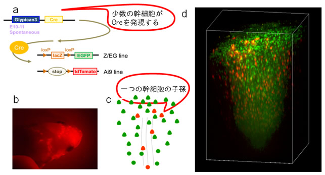 そこで、本研究グループは、異なる機能の細胞が混ざり合っていること(図1b)と、異なる神経幹細胞から生み出された神経細胞が混ざり合って分布していること(図2b)には、何らかの関係があるのではないかと考えました。最近の研究により、同じ神経幹細胞の子孫同士は、生後の大脳皮質で、選択的に結合している確率が高いこと(図2c)が報告されています。このことから1つの神経幹細胞から分化した子孫同士は、この選択的な結合によって、生後に、似た方位選択性を獲得するのではないかと仮説を立てました(図2d)。もし、この仮説が正しければ、異なる機能の細胞が混ざり合っている構造は、異なる神経幹細胞の子孫が混ざりあっていることになります。