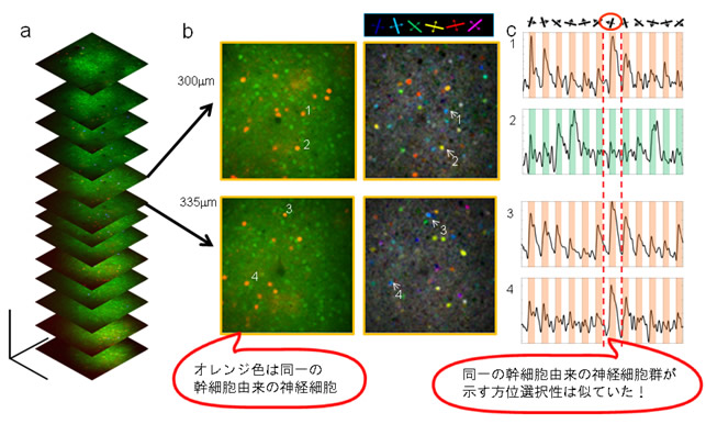 同じ神経幹細胞から生み出された細胞を同定するために、遺伝子組換えマウスを用いました。この遺伝子組換えマウスは、共同研究者のカルロス・ロイス博士らにより開発されたもので、ごく少数の神経幹細胞でのみ遺伝子組換えが起こり、その子孫の神経細胞が全て蛍光たんぱく質で標識されます(図3a、b)。この遺伝子組換えマウスと2光子顕微鏡を用いて、生きたままのマウスの脳で、蛍光たんぱく質で標識された同じ神経幹細胞から生み出された神経細胞を観察しました(図3c)。マウスの脳内にある個々の神経細胞の方位選択性を調べるために、私たちが2005年に世界で初めて開発した、2光子カルシウムイメージングによる機能マッピング注5)という方法を用いました(図1a)。この方法を用いると、何千もの脳内の神経細胞の活動を同時に計測し、どのような視覚刺激を与えた時に、それぞれの神経細胞が反応するか、細胞の方位選択性を調べることができます。