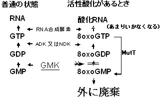 | 【右図の説明】 酸化されたRNAの合成を阻害する仕組み。RNAを作る出発材料は、GMPという物質です。GMPはGMKという酵素によってGDPになります。できたGDPは、ADK又はNDKという酵素でGTPになります。このGTPを使ってRNA合成酵素によりRNAが作られます。活性酸素があるとき、これらの物質が酸化され(8oxoが付く)ますが、GMKは8oxoGMPを8oxoGDPにできません。ADK又はNDKは8oxoGDPを8oxoGTPにできます。MutTは8oxoGTPを8oxoGMPにできます。8oxoGMPは外に廃棄されます。 |