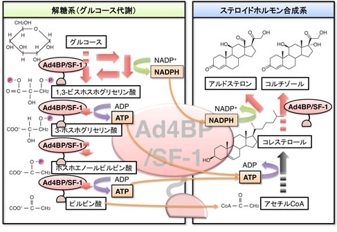 ステロイドホルモン(アルドステロンやコルチゾールなど)の合成には、原材料および補酵素として、アセチルCoA(図中、右下)、ATP(オレンジ色で表示)、NADPH(オレンジ色で表示)が必要です。ATPおよびNADPHはグルコースの代謝過程で産生されます。また、解糖系の最終産物であるピルビン酸はアセチルCoAに転換されます。このようにAd4BP/SF-1は、アセチルCoA、ATP、NADPHの産生系(解糖系)と消費系(ステロイドホルモン産生合成系)を同時に制御していることが分かりました。このような仕組みにより、効率的なステロイドホルモン産生が可能になっていると考えられます。