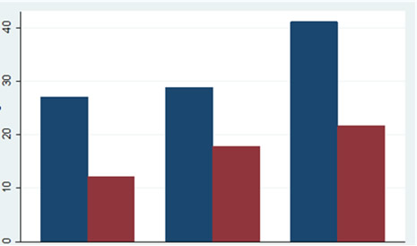 | 青 燃えつき症候群の割合(%) 赤 重篤な燃えつき症候群の割合(%) 縦軸 燃えつき症候群の割合(%) (図2)労働時間/週当たりと燃えつき症候群の割合 |