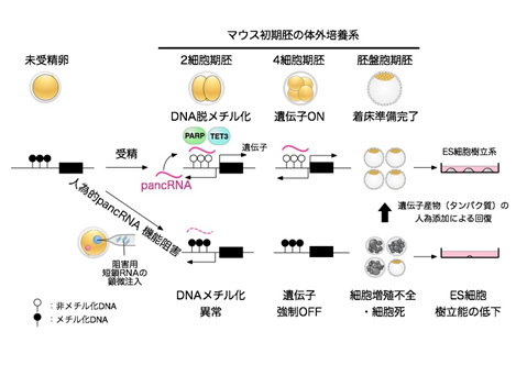 ゲノムには遺伝子(黒ボックス)がコードされており、その上流はプロモーターと呼ばれ、DNAメチル化などによる遺伝子発現調節が可能となっている。遺伝子の一部はこのプロモーター部分からpancRNAが生み出されることにより、遺伝子発現を正に調節していることが分かった。pancRNAの機能阻害により遺伝子発現はOFFになり、胚にさまざまな異常が確認され、ES細胞を含むいわゆる幹細胞が正常に機能しなくなる。このような異常は、pancRNAによって制御される遺伝子がコードするタンパク質を培養液中に添加することにより、回復させることができる。