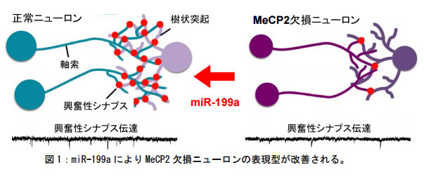 そこで本研究グループは、これまで知られていない MeCP2 の機能が存在する可能性を考慮し、プロテオミクス技術(※5)や次世代シークエンス技術(※6)を用いた網羅的な解析から、MeCP2 がmiRNA マイクロプロセッサーである Drosha 複合体(※7)と会合して、特定の miRNA の生合成(プロセシング)を促進することを見いだしました。さらに研究グループは、MeCP2 の下流標的 miRNAとして miR-199a を同定し、この miR-199a が異常な興奮性シナプス伝達および興奮性シナプス密度、細胞体サイズの減少などの MeCP2 欠損ニューロンの代表的な各種表現型を改善できることを明らかにしました(図 1)。さらに詳細な解析により、miR-199a は mTOR シグナルを負に制御する因子の発現を抑制することで、最終的に mTOR シグナルの活性化を亢進することをつきとめました。また、この miR-199a の発現を遺伝学的に減少させたマウスを作製したところ、このマウスは MeCP2 欠損マウスに見られる多くの表現型を示すこと、脳において mTOR シグナルの減弱がみられることが明らかになりました。加えて、研究グループは、レット症候群患者の脳組織においても、miR-199a の発現が実際に低下していることを突き止めました。