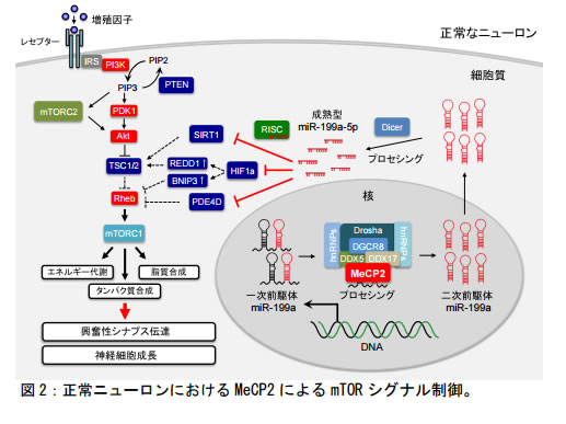 一方で近年の研究により、発達障害を含めた種々の精神疾患の発症には、mTOR シグナルの制御不全が深く関与することが示唆されています。最近、レット症候群およびモデルマウスにおいても、この mTOR シグナルの減弱がみられることが相次いで報告されました。しかし、MeCP2 がどのようにmTOR シグナルを制御しているのかは明らかにされていませんでした。