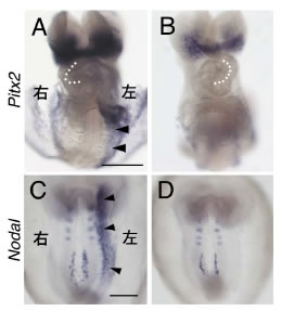 Pitx2 発現を検出しています(青紫色)。胚前方から撮った写真。点線は心臓ルーピングを示しており、Bでは左右が逆転しています。矢尻は左側側板中胚葉のPitx2 発現を示しており、Bでは同部位の発現が消失しています。
