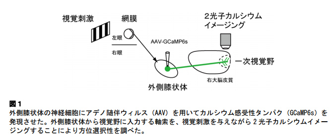 私たちは物を見て、それが何であるかを認識することができます。この仕組みの全貌はまだ解明されていません。視覚情報はまず網膜によって捉えられ、外側膝状体を経て大脳視覚野へと伝えられます。視覚野や高次視覚野で情報が処理された結果、物体の形を認識できると考えられています。物体の形を認識するのに重要な情報として、「輪郭」があります。輪郭は様々な傾きを持つ線から構成されていて、例えば、長方形の物体の輪郭は縦向きと横向きの線から出来ています。視覚野の神経細胞には特定の傾きの線に反応するものが存在し、この性質は「方位選択性」と呼ばれています。方位選択性を持つ神経細胞が、線の傾きを検出して物体の輪郭の認識に重要な働きをしていると考えられています。ネコ、サル、ヒトなどの高等哺乳類を用いた研究では、方位選択性をもつ神経細胞は網膜や外側膝状体にはほとんど存在せず、大脳視覚野で初めて現れます。そのため、方位選択性は外側膝状体の情報を使って大脳の神経回路で作られると考えられています。近年、遺伝子改変が可能なマウスが実験動物として重要視されています。マウスは高等哺乳類と違って、外側膝状体の神経細胞の一部は既に方位選択性を持つことが報告され、これが視覚野の方位選択性にどのような影響を及ぼしているのかが問題となっていました。そこで研究グループは、マウスの外側膝状体から視覚野に入力する軸索(※3)を機能イメージングすることで、外側膝状体から大脳視覚野に入る情報に方位選択性があるかどうかを調べました。