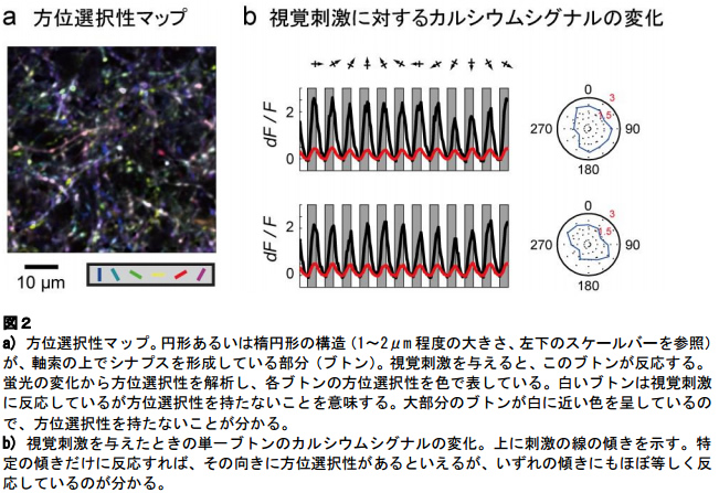 外側膝状体から視覚野に入力する軸索の大部分は、脳の表面から深い場所に分布しています。ところが、2 光子励起顕微鏡で脳の深部を観察すると画像が不鮮明となり、イメージングの分解能が低下します。軸索は非常に細い小さな構造(1/1000 mm 程度)のため、分解能の低下によりイメージングが困難になります。この問題を解決するため、研究グループは顕微鏡を調整することにより高い分解能で深部に入力する軸索をイメージングすることに成功しました。その結果、外側膝状体から視覚野に入力している軸索は、あまり方位選択性を持たないことを発見しました(図 2)。従ってマウスの視覚野で、外側膝状体からの入力を直接受け取る神経細胞の方位選択性は、高等哺乳類と同様に、大脳の神経回路によって形成されていることが示唆されました。