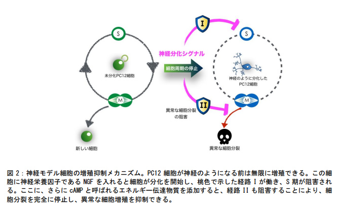 細胞の増殖には 2 つのステップがあり、ゲノム DNA を複製するステップ(S 期)と、複製したゲノム DNA を等分に分配するステップ(M 期)があります。これまで、神経細胞が増殖しないメカニズムの研究により、S 期の制御が大事であることはよくわかっていました。今回、本研究グループは、神経モデル細胞であるラット PC12 細胞(※2)を用いることで、M 期の制御も同様に大事であることを明らかにしました(図 2)。すなわち、S 期だけではなく、M 期にも制御メカニズムを働かせることで、神経細胞には二重の厳重なセキュリティがかけられていると考えられました。