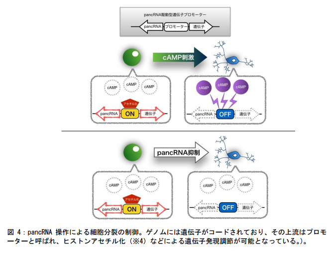 pancRNA のそれぞれは、特定の遺伝子とペアで機能しうると考えられます。昨年、本研究グループは、pancRNA が遺伝子機能を ON にするメカニズムに関与することで、ほ乳類個体発生のごく初期から機能していることを明らかにしていました(2015 年 2 月 5 日付けプレスリリース参照:図 3)。今回、同様のメカニズムが、上記の最終分化細胞の増殖制御にまで必須であることが新たに明らかとなりました。