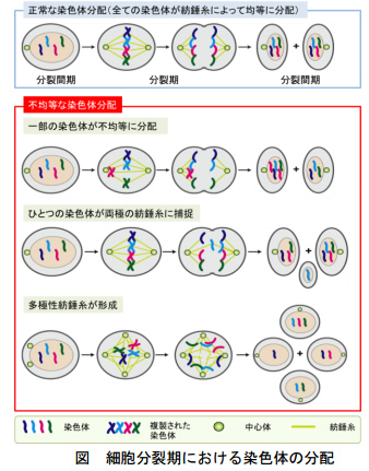 しかしながら多くの固形癌(>85%)(※2)において、染色体数が変化(増加あるいは減少)した異数性と呼ばれる状態が観察されます。異数性は、細胞分裂時における染色体の分配に異常(図、下)を起こすことが起因していると考えられており、異数性を起こすことが癌の発生や悪性化に寄与していることが数多く報告されています。