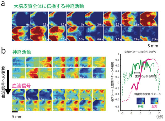 b) 神経活動の空間パターンが時間遅れをもって血流信号の空間パターンに変換される様子。 |