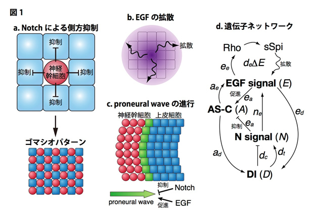 細胞と細胞が情報のやりとりをする時,長距離性の情報伝達は拡散性のタンパク質によって,短距離性の情報伝達は細胞膜上のタンパク質によって隣接する細胞に伝達されます。EGFは長距離性の,Notchは短距離性の情報伝達を担う中心的な因子として知られています。Notchの短距離作用は側方抑制(※5)と呼ばれ,例えば図1aにおいて四角い細胞が丸い細胞に変化(分化)する時,丸い細胞は隣り合う細胞に対して抑制性のシグナルを送り,それによって丸い細胞の隣りには必ず四角い細胞が存在するようなゴマシオパターンを形成します。一方EGFは拡散性因子であり,産生された領域から離れた場所において長距離作用を及ぼします(図1b)。NotchとEGFはどちらも様々な生命現象において重要な役割を果たしますが,Notchによる側方抑制とEGFの拡散効果が協調して働いた時にどのような効果をもたらすのか,明らかにされていませんでした。