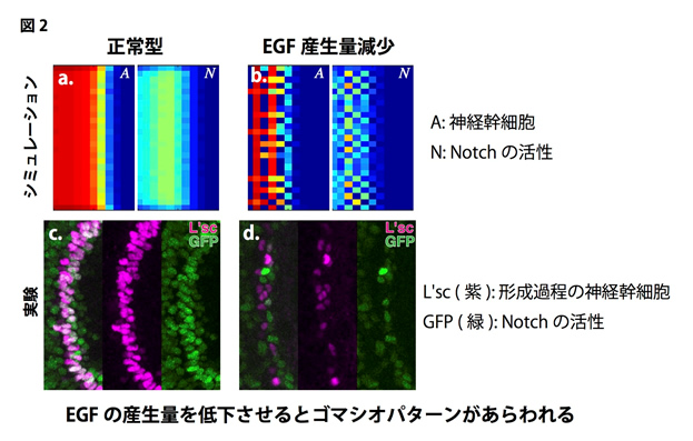 では,ゴマシオパターンは一体どこに行ってしまったのでしょうか?EGFは拡散性因子であり,Notchがゴマシオ状に活性化していたとしても,EGFの拡散効果によってそれが隠されてしまう可能性が考えられました。そこでシミュレーション上でEGFの拡散もしくは産生量を減少させたところ,そのような状況下ではゴマシオパターンが現れることが予測されました(図2b)。EGFの活性が完全に無くなってしまうとそもそも波が消失してしまうため,我々はRNAiと呼ばれる技術によってEGFの活性を中程度に減少させることを試みました。その結果,Notchの活性および神経幹細胞の形成パターンがゴマシオ状に変化し,生体内においてもシミュレーション上と同じような互い違いのパターンが観察されました(図2d)。これらの結果から我々の数理モデルが正しいこと,そしてNotchによる側方抑制が確かに生体内においてProneural Waveに含まれていることが示されました。