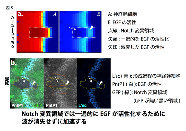 私たちは上記の数理モデルにおいてNotch変異領域を設定し(図3a点線内),どのようなことが起きているか観察しました。興味深いことに,Notch変異領域において波が加速する際,一過的にEGFが活性上昇し,その後減衰することが分かりました。Notch自体は神経幹細胞の形成を阻害するので,EGFが活性化し,かつNotchが失われた状況では神経幹細胞の形成は加速するはずであり,これがNotch変異領域において波の進行が加速する原因であると考えられました。これと同じことが生体内でも起きているか調べたところ,シミュレーションと同様,EGFの活性が一過的に上昇していることが確認されました(図3b)。このように,数理モデルを用いることによって従来の生命科学実験だけでは解決できない問題が解決されたのです。
