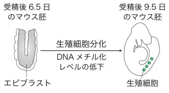 | マウスでは受精後 6.5 日の胚のエピブラストと呼ばれる体細胞から生殖細胞が誕生します。この過程では大規模な DNA メチル化の低下が生じます。この生殖細胞の発生過程を体の外で再現したのが、今回研究に用いた生殖細胞誘導系です。この誘導系をヒトにおいても確立できれば、不妊や流産の原因解明に 役立ち、これらの病気に悩むカップルにとって大きな福音となることが期待されます。 | ||