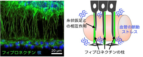 本研究から、細胞の外にも特徴的な構造物があること、さらにその制御には血管の脈動に派生する「力」が関わることがわかりました。本研究によって、メカニカルストレス(※4)の観点から組織形態形成のしくみを理解する道が拓けました。動脈硬化現象が周辺の細胞環境に及ぼす影響等の解明に繋がることが期待されます。