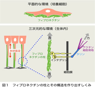 | (※1) | フィブロネクチン:細胞外基質を構成するタンパク質の一種。 細胞膜上の受容体と結合することにより、細胞—基質間の接着を担う。 |
