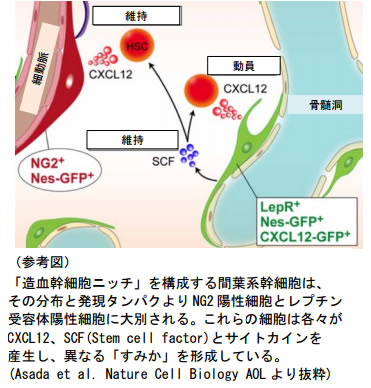 我々の血液にも、赤血球、白血球、血小板といったすべての血液細胞を作る元になる細胞が存在し、「造血幹細胞」と呼ばれています。造血幹細胞は、骨髄に主に存在しており、骨などの元になる間葉系幹細胞がその「ニッチ」細胞として知られておりましたが、その詳細なメカニズムは、 わかっておりませんでした。今回のこの発見は、造血幹細胞の効率的な増幅法の開発、ひいては再生医療の加速に貢献すると期待されます。