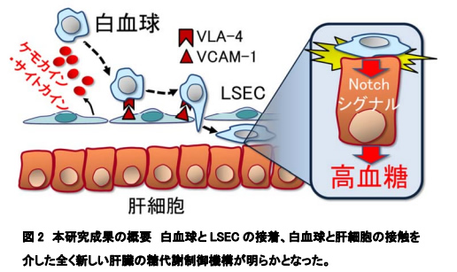本研究では、肥満マウスの肝臓で好中球や単球が VLA-4 を介して肝類洞内皮細胞に接着して肝臓内に浸潤すること、浸潤した白血球が肝細胞と接触することにより、肝細胞の Notch シグナルを介して糖代謝異常を惹起することを明らかにしました。