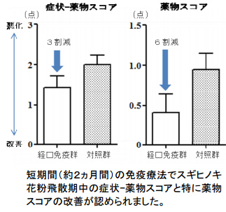 スギ抗原-ガラクトマンナン複合体を用いた腸管免疫を利用した免疫療法は、従来の免疫療法では実現できなかった短期間で治療効果が期待できる新しい免疫療法です。最新の研究(論文)では、標準的治療に比べ、約6割、抗アレルギー薬を減らす効果が認められました。本研究は和興フィルタテクノロジー株式会社、日本学術振興会の助成を受け行われました。この成果を報告した論文は2017年4月11日 (火)に国際科学誌Scientific Reports オンライン版にて発表されました。