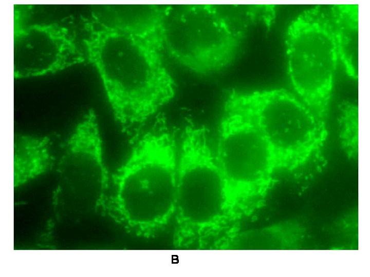 <写真説明>ヒトのHeLa細胞の蛍光顕微鏡写真。A:ミトコンドリアDNAの蛍光染色。薄く白い糸状に見えるのはミトコンドリア。その中で濃く白い顆粒状に見えるのがミトコンドリアDNA。核は抜けて見えている。B:活性酸素の蛍光染色。丸く抜けて見えるのは細胞の核。核周囲に緑に光っているのが活性酸素。活性酸素が主にミトコンドリアで発生していることを示している。