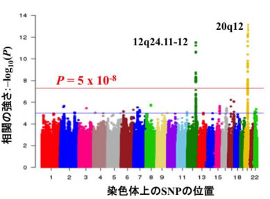 全ゲノム相関解析の結果。横軸は SNP の染色体ごとの位置。SNP を染色体ごとに色分けして示している。 縦軸は P 値の対数値で示した相関の強さ。有意水準を表す赤線(P=5.0×10-8)を超える強い相関を示すゲノム領域が、12 番染色体の 12q24.11-12(P=2.97×10−12)と20番染色体の 20q12(P=7.05×10−14)の 2 カ所同定された。 |