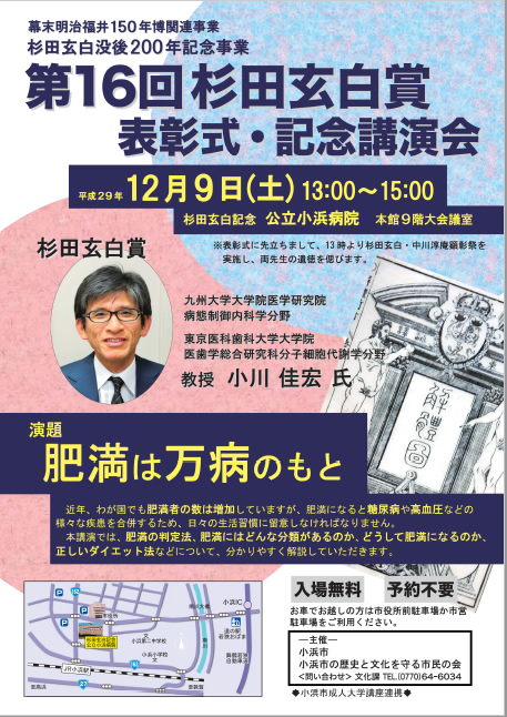 杉田玄白賞は、小浜藩医であった偉人杉田玄白先生の「医食同源」の理念に沿い、食と医療・健康増進に関する進歩的な研究や取り組みを行っている者などを顕彰するもので、小川教授は、「生活習慣病の分子機構の解明と新しい治療戦略の開発に関する研究」や、一般の方に向けた講演活動などが評価されました。